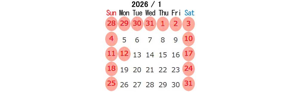 | 1/12、2/13,23、3/20 | 休日 |