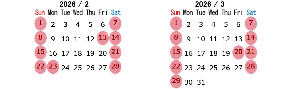 | 日曜日 教室のみ | 10:00 - 11:30 13:00 - 14:30 |