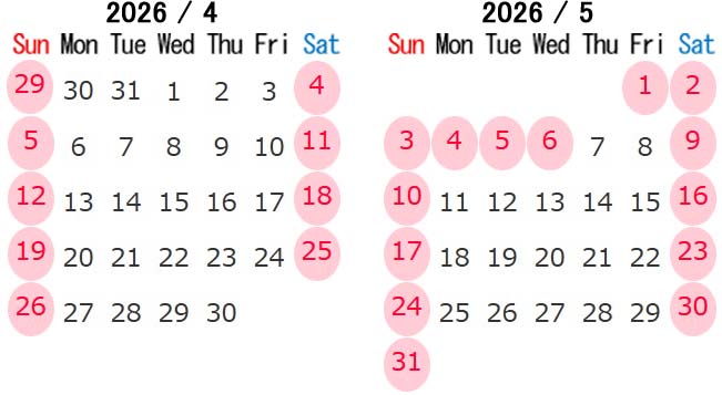 | 5/1,4,5,6、7/20、8/13,14 | 休日 |